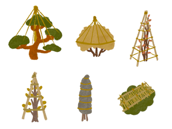 こもれびガーデンの冬囲いは縄や竹を節約はいたしません。鉢巻き(下縛り)もしっかり縛ります。枝が折れるほど絞りはしませんが、冬を耐えられるよう頑丈に囲わせていただきます。